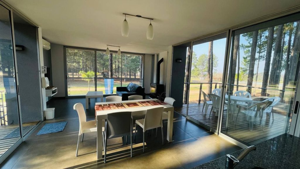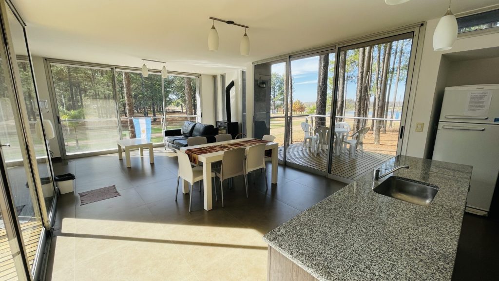 La casa cuenta con un diseño moderno y funcional, donde el living, comedor y cocina se integran en un amplio espacio luminoso, con grandes ventanales que conectan el interior con el paisaje.
